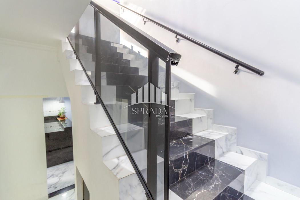 Escada larga com lustre de 2,5 metros.